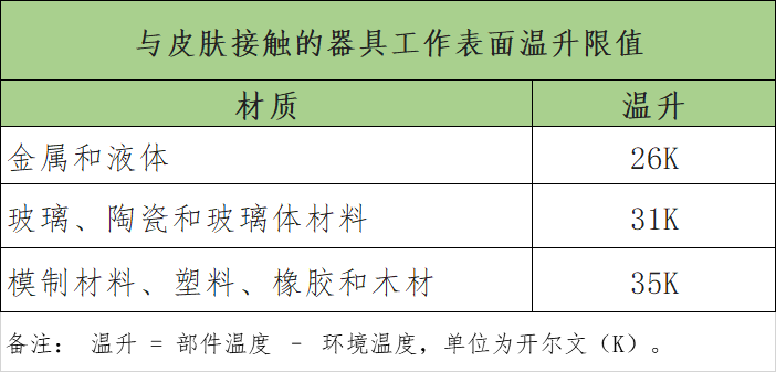 本次在对家用美容仪产品进行温升测试时,主要依据GB/T36419-2018《家用和类似用途皮肤美容器》标准附录A.4要求,与使用者或被护理人身体接触的器具工作表面的温升要求如下: