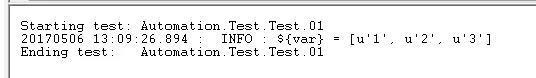 运行通过,打印出了变量值,可以看到正如我们预期,${var}是一个列表,这里发现列表里每一个值前面都有一个u,这是因为RF默认是Unicode编码,这里的u对你的用例或断言都没有影响的。