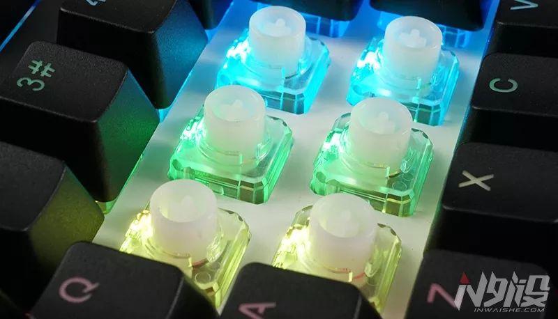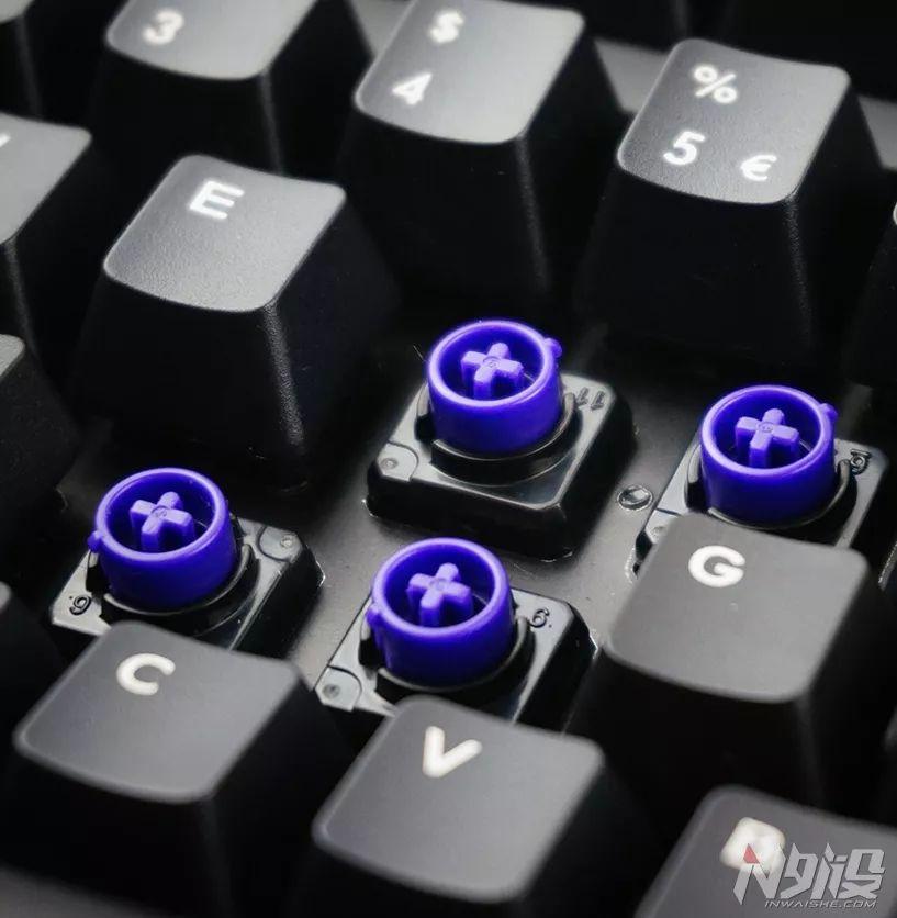 历经多年发展,Topre静电容键轴也并非一成不变。曾授权技术给酷冷,推出首款兼容MX轴键帽的静电容键盘:酷冷紫星,同时拥有更为骚气的定制紫色轴柱,而且价格相对亲民,在当时备受关注,也因此成为不少外设发烧友入手的第一款静电容键盘。圆柱口静电容键轴不再是唯一选择,RealForce RGB静电容键盘则是同样采用十字结构设计轴柱,加上自身标准108键配列,相对传统静电容键盘,直接兼容MX轴个性键帽,可玩性要高一些。与此同时,跟上时代步伐,RGB灯光元素也首次出现在其静电容键盘上。键轴外壳改成透明材质,并且采取上灯位设计,加入导光柱,RGB LED则是贴片式方案,在PCB主板上。结合新的双色注塑透光键帽,与白色钢板,实现均匀发光效果。