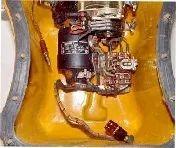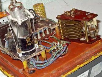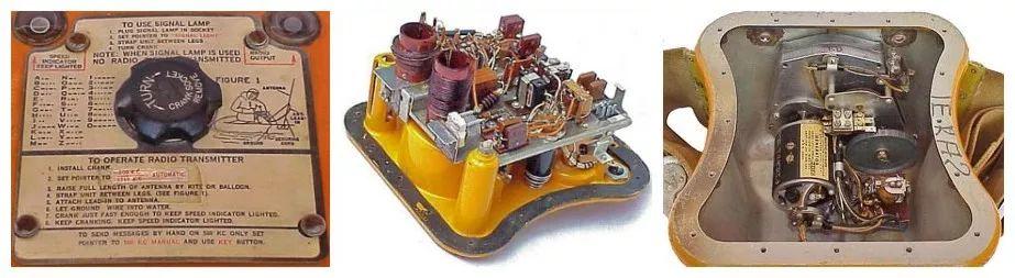 带有莫尔斯电码的操作说明板安装在AN / CRT-3(左)的顶部。 发射器部分的内部视图(中心)。 双电压发生器带齿轮和自动发射器触点(右)。