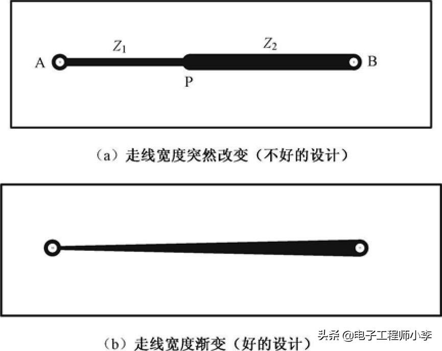 在进行射频PCB的设计时,不仅对走线的拐角要求是重要的,对整条走线的平滑要求也是很重要的。如图12-62(a)所示,走线从A到B的宽度有一个突然的改变(P点)。微带线的特征阻抗主要取决于它的宽度。P点的特征阻抗会从Z 1 跳变到Z 2 。因此,该走线实际上成为一个阻抗变换器。这个阻抗额外跃变,对电路性能来说可能导致灾难性的后果:RF功率可能在P点来回反射。另外,在P点,RF信号也会辐射出去,因此要求走线宽度渐渐改变,如图12-62(b)所示,即要求走线的阻抗的变化是平缓的,以使在这条走线上附加的反射和辐射减小。