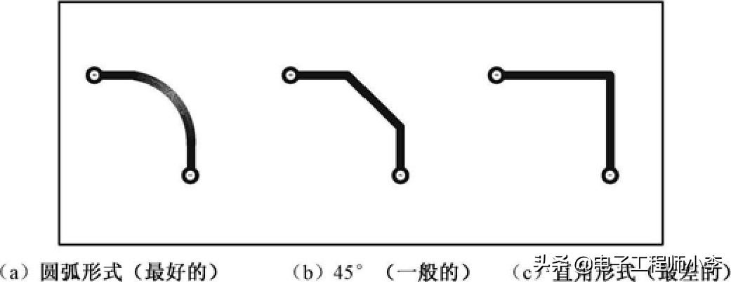 在进行射频PCB的设计时,要求走线的拐角尽可能平滑。在射频PCB中的拐角,特别是急拐弯的角度,会在电磁场中产生奇异点并产生相当大的辐射。在如图12-61所示的实例中,图(a)的拐角形式优于图(b)和图(c),因为图(a)是平滑的,是最短的连接线。