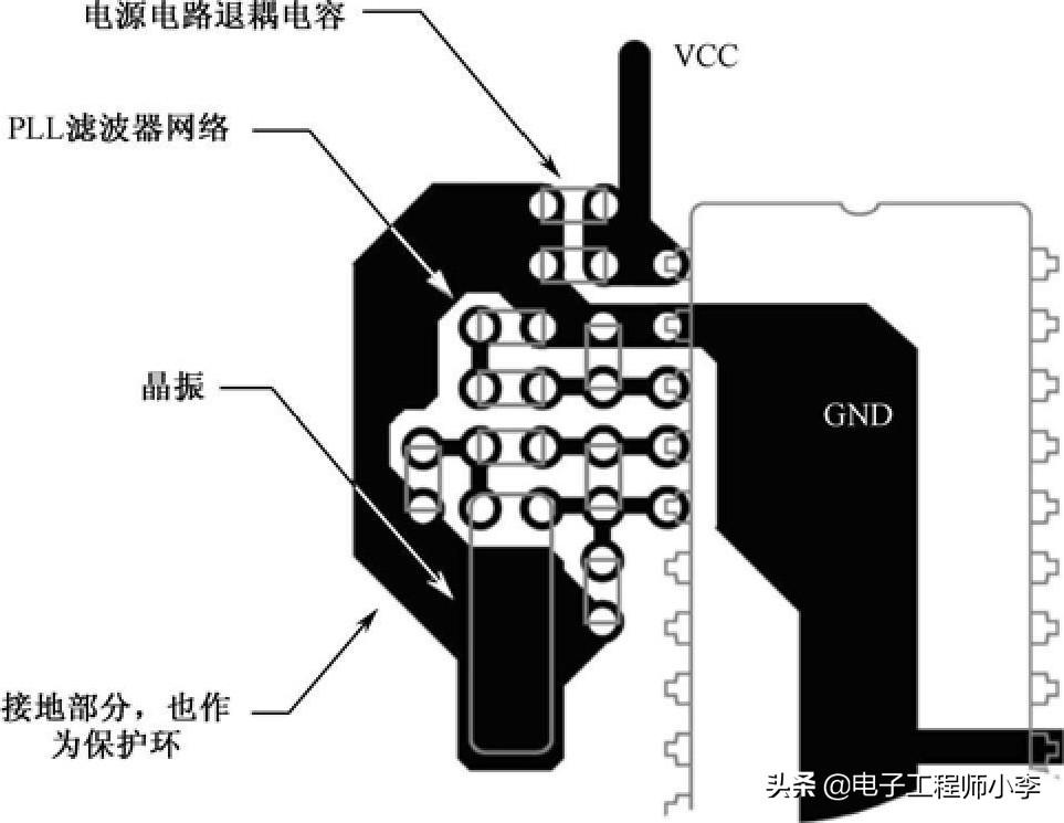 PCB保护环是一种可以将充满噪声的环境(如射频电流)隔离在环外的接地技术。一个PLL滤波器保护环设计实例如图12-52所示。