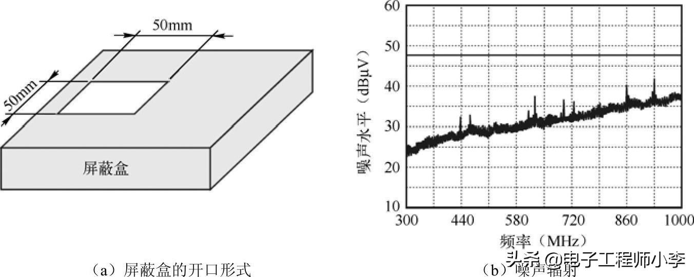 使用金属盒对测试板进行屏蔽,使用1m法对辐射噪声进行测量(信号频率为25MHz)。假设屏蔽盒的开口总面积约为2500mm 2 。屏蔽盒开口的影响如图12-55~图12-58 [91] 所示。从这些测量中可以看出,当开口面积被分割成小孔时可以获得较为优越的屏蔽效果。但是当屏蔽盒具有单个矩形开口时,将会显著地降低屏蔽效果。一般来说,盒形屏蔽比板状或线状屏蔽有更小的剩余电容,全封闭的屏蔽体比带有孔洞和缝隙的屏蔽体更为有效。