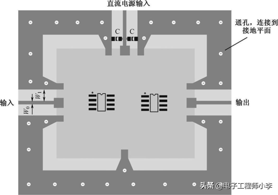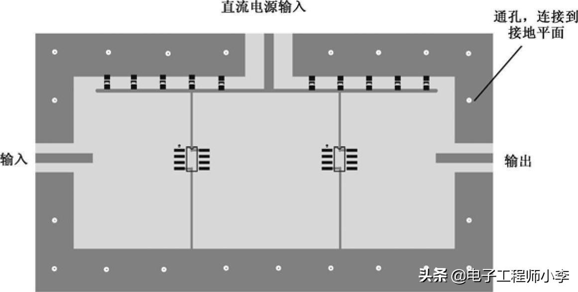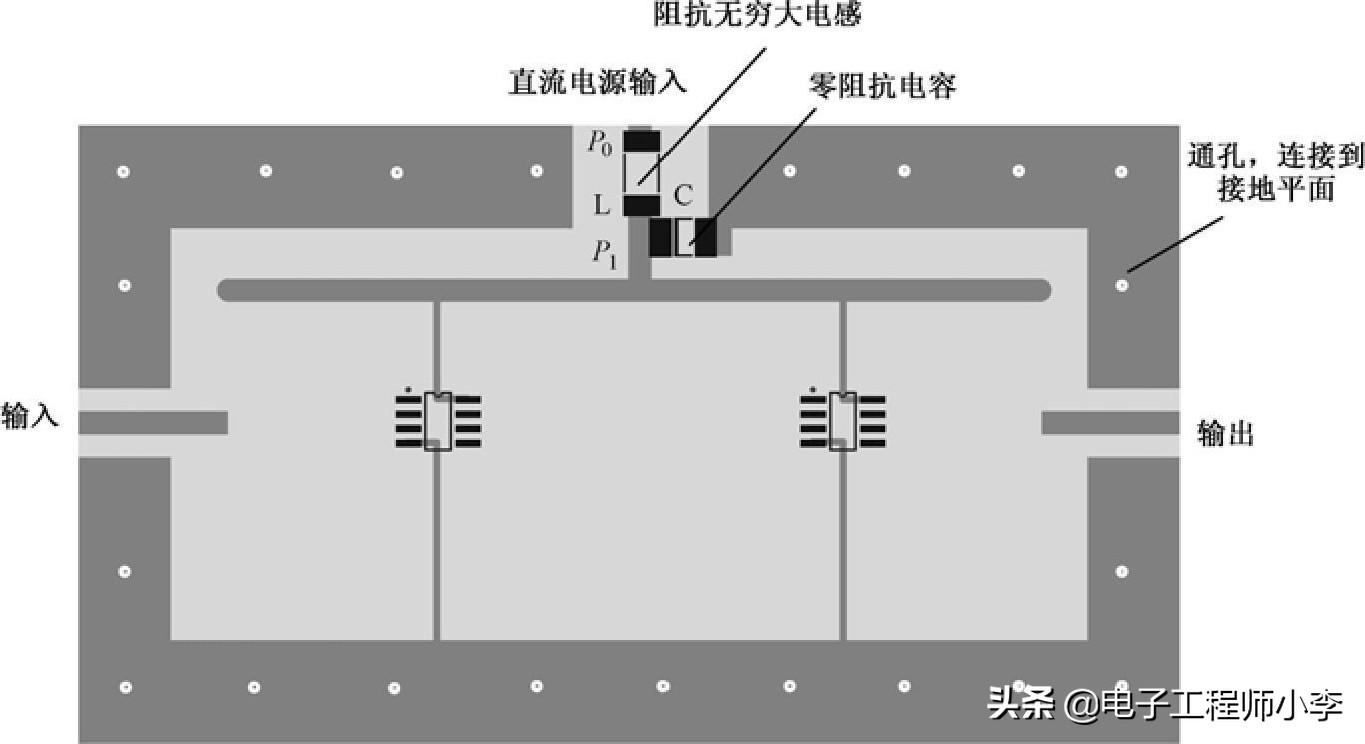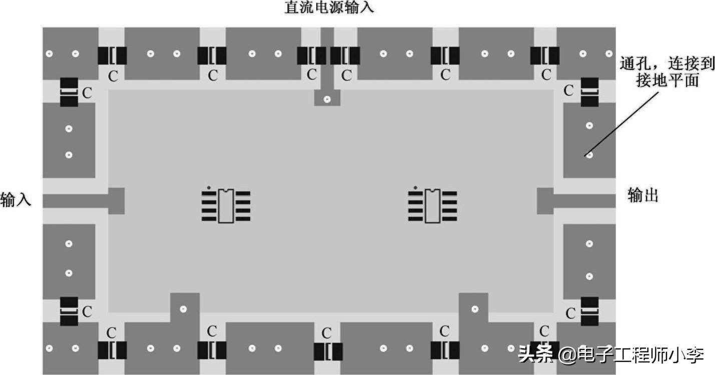 在射频电路板上,必须提供一个对输入和输出端口的任何射频信号都能作为“零”或参考点的共用射频接地点(这些点必须是等电位的)。在射频电路板上的直流电源供电端和直流偏置端,直流电压必须保持在直流电源供电的原始值上,但对可能叠加在直流电压上的射频信号,必须使它对地短路或将其抑制到所要求的程度。换句话说,在直流电源供电和直流偏置端,其阻抗对交流或射频的电流或电压信号必须接近于零,即达到射频接地的目的 [7] 。