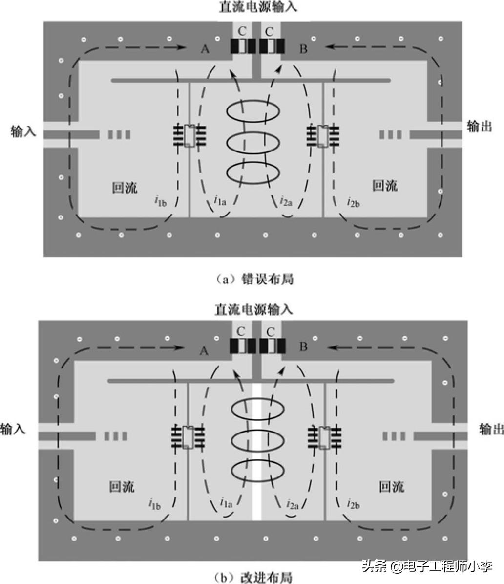 由于i 1a 和i 2a 汇流在一起,故在i 1a 和i 2a 间的串扰是电磁耦合。当它们之间的耦合或串扰不可以忽略时,其相互作用就等同于从模块2到模块1之间存在某种程度的反馈,而这种反馈可能会使电路的性能变差。减少这种耦合的一种简单方法如图12-53(b)所示,可以在PCB底层中间敷铜部分切开一条缝,目的是尽可能消除或大大减少在i 1a 和i 2a 间的回流。
