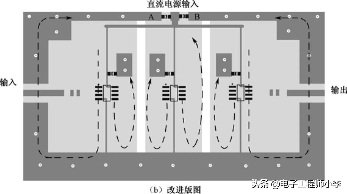 一个设计实例如图12-53所示。在图12-53(a)中,由两个模块组成的电路安装在PCB上,PCB的底层敷满了铜,并通过许多连接过孔连接到顶层接地部分。对直流电源而言,底层和顶层的铜覆盖的部分为直流接地提供了一个良好的平面。在直流电源和接地点A、B之间连接“零阻抗”的电容到地,使直流电源和接地点A、B之间对射频信号短路,不形成射频电压。只要PCB的尺寸比1/4波长小得多,整个接地部分就不会形成射频电压。虽然在这些模块间存在耦合,但也可以保证电路性能优良。