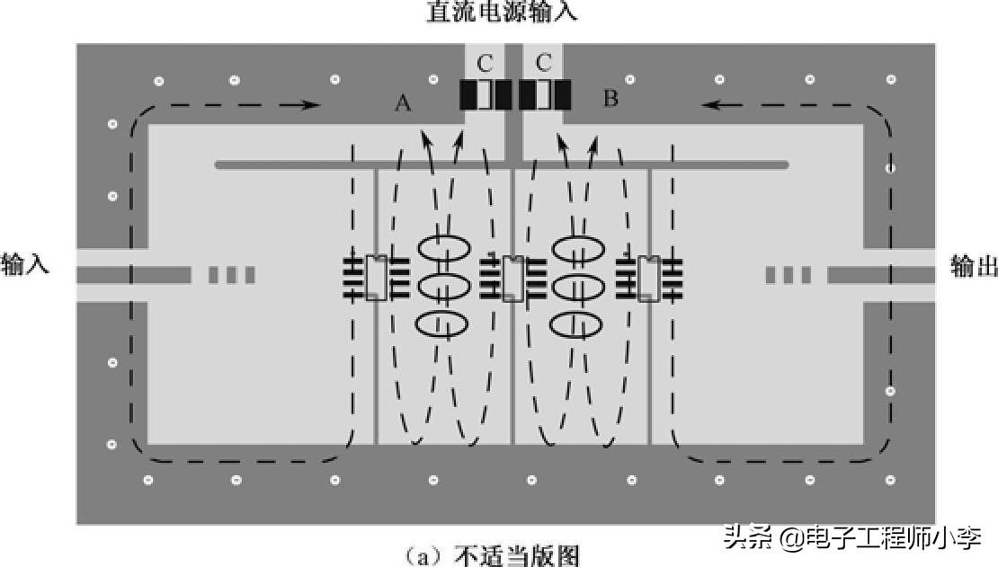 由于采用共用的直流电源供电,所以进行PCB设计时也必须注意前向电流的耦合或串扰。如图12-54(b)所示,可以为PCB上的每个独立模块提供直流电源,并加上许多“零阻抗”电容,以保证为每个模块提供的直流电源与其相应的相邻接地点A、B、C和D之间的电位差接近于零。在“零阻抗”电容之间必须有足够小的金属区域使得在“零阻抗”电容间的小金属块电位大致等于零电位。