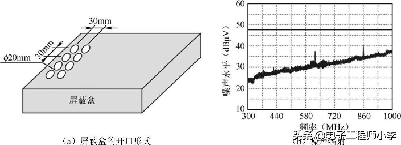 使用金属盒对测试板进行屏蔽,使用1m法对辐射噪声进行测量(信号频率为25MHz)。假设屏蔽盒的开口总面积约为2500mm 2 。屏蔽盒开口的影响如图12-55~图12-58 [91] 所示。从这些测量中可以看出,当开口面积被分割成小孔时可以获得较为优越的屏蔽效果。但是当屏蔽盒具有单个矩形开口时,将会显著地降低屏蔽效果。一般来说,盒形屏蔽比板状或线状屏蔽有更小的剩余电容,全封闭的屏蔽体比带有孔洞和缝隙的屏蔽体更为有效。