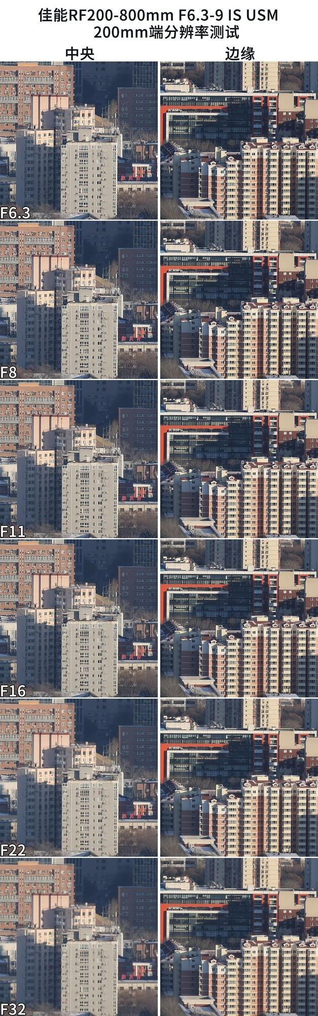 在分辨率测试环节,我采用的是拥有4500万有效像素的佳能全画幅微单相机EOS R5,针对这枚镜头的200mm、400mm、600mm和800mm端进行测试。测试时使用光圈优先模式,感光度设定为ISO 100,使用RAW+JPEG格式记录,光圈逐级变化。最后100%放大并截取画面中心和边缘的画面进行对比。