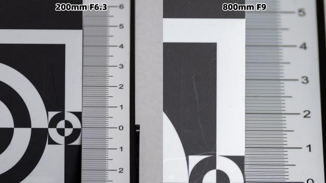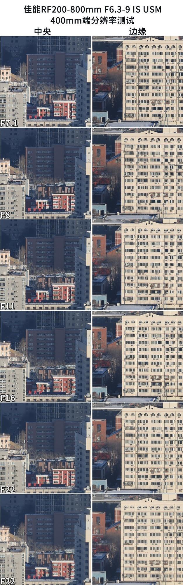 800mm端最大光圈是从F9开始的,从上面的图片我们可以看到,画面中央区域从F9开始一直到F22光圈下,分辨率表现都很不错,边缘地区也仅仅是从F22光圈开始显得松散。