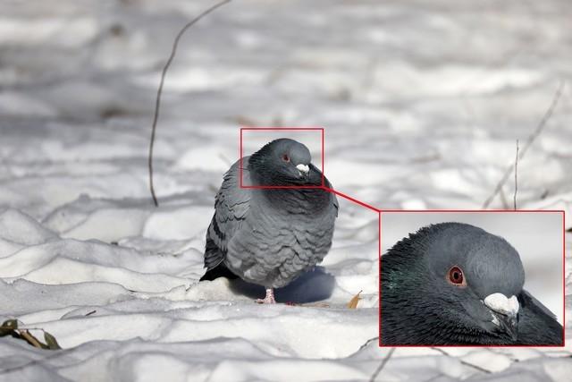上面这张照片是我用EOS R5搭配这枚镜头拍摄的鸽子,百分百放大照片可以看到鸽子眼睛与羽毛的细节非常丰富,整体成像锐度非常高。