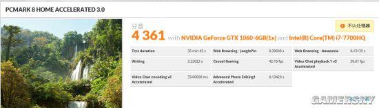 而在PCMARK的 Home accelerated模式中,微星GP72VR 7RF得分为4361。不过PCMark的硬件性能显示有点问题,显示显卡为GTX 1060(6G),实际显存只有3G,这应该是因为PCMark通过识别GPU芯片规格来判定显卡型号,并不检查显存的实际容量而产生的错误。这里也可以看出,微星GP72VR 7RF采用的是和桌面级GTX 1060(6G)显卡相同规格的GPU核心。