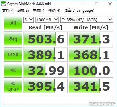 看CrystalDiskMark的性能,主要看4K性能测试,在4K性能测试中,微星GP72VR 7RF游戏本的固态硬盘读取速度为32.99MB/s,写入速度为100.0MB/s。
