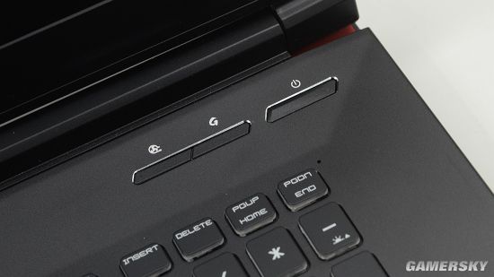 键盘区的右上角则是开机及功能按键,从左到右依次是高性能散热模式(开启后风扇会以满载转速运行,以增加散热效能)、龙盾控制中心启动按键(一键启动龙盾控制中心,对笔记本灯光、音效、工作模式等进行设置)以及开机按钮(长按则是关机功能)。