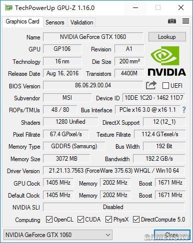 自GTX 10系列显卡开始,便携式PC都采用了和桌面级相同规格的GPU核心。从GPU-Z上显示的信息来看,微星GP72VR 7RF采用了一颗完整的GP106核心,拥有1280个流处理器单元,核心频率为1405/1671MHz,和完整规格的桌面级GTX 1060相比,只是少了3GB显存容量,以及核心频率低了一点。不过对于1920*1080分辨率显示屏而言,3GB显存和6GB显存没有差别,都已经够用,几乎不会出现游戏爆显存的情况,至少目前为止,小编还没遇见过1080P分辨率下3G显存被爆的情况。