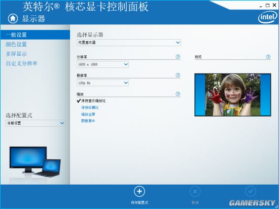 在Intel核显控制面板界面,我们可以看到微星GP72VR 7RF显示屏的刷新率为120Hz,能为用户提供更流畅的游戏视觉效果。