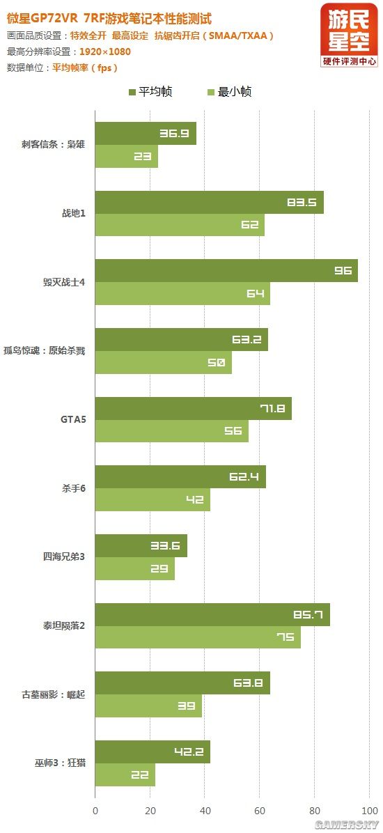 这次小编挑选了十款当前热门单机游戏,游戏分辨率使用屏幕最佳分辨率1920*1080,游戏画质特效全部开启,抗锯齿适当开启。从测试的游戏平均帧数结果来看,微星GP72VR 7RF游戏笔记本能流畅运行大部分游戏,即便是对硬件性能要求极高的《巫师3》和《四海兄弟3》,也能确保游戏平均帧数稳定在30FPS以上,面对那些性能性能要求不高的竞技类游戏,那就更是游刃有余,配合上120Hz刷新率显示屏,一定会给玩家带来不一样的游戏体验。