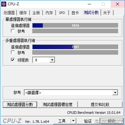 CPU-Z的测试结果,单核能力得分1815,八线程能力7287。