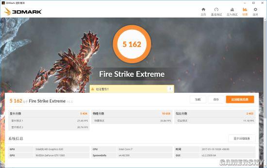 在3DMARK的Fire Strike Extreme模式中,微星GP72VR 7RF综合得分5162,显卡得分5434。