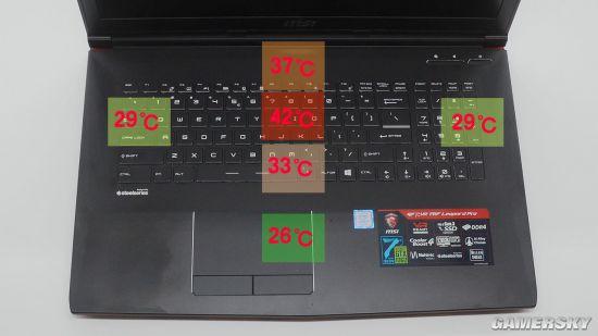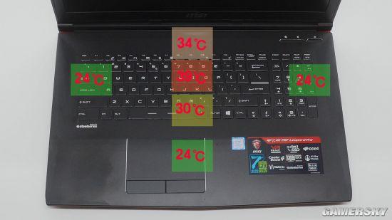对比普通散热模式和高效散热模式下的温度分布情况,可以看出在开启高效散热模式之后,微星GP72VR 7RF游戏笔记本的整体温度大约降低了3℃,但在开启高效散热模式之后,散热风扇的噪音也提高了不少,可谓是一把双刃剑。