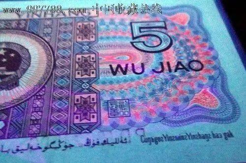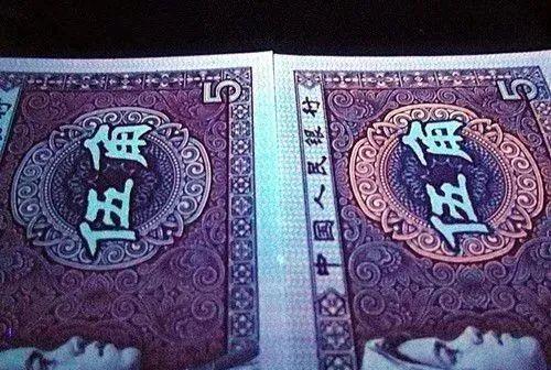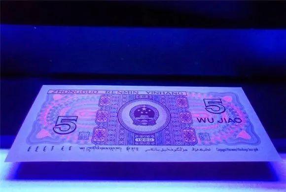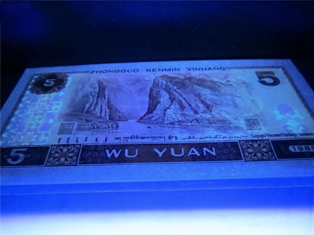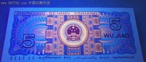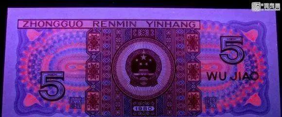把钱币放在荧光灯下面,80版5元“苍松翠鹤”的钱币正面的左边,会出现一颗苍松的图案而且颜色是翠绿色的,松鹤由红、蓝、绿三种不同的颜色构成。