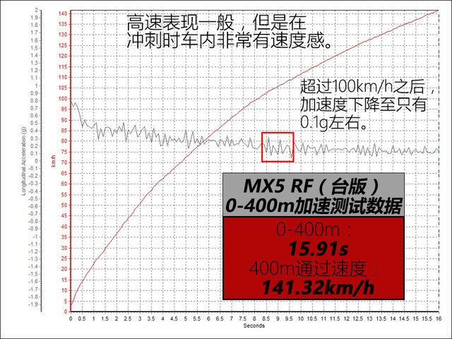 不过来到0-400m的环节中,MX-5 RF的表现则非常一般,没办法,它的动力就在那儿摆着呢。如同我一开始所说的,MX-5车系的精髓从来就不是动力,如果你真的很喜欢这辆车,又不满足于它的动力,国外有大把的动力套件等着你。