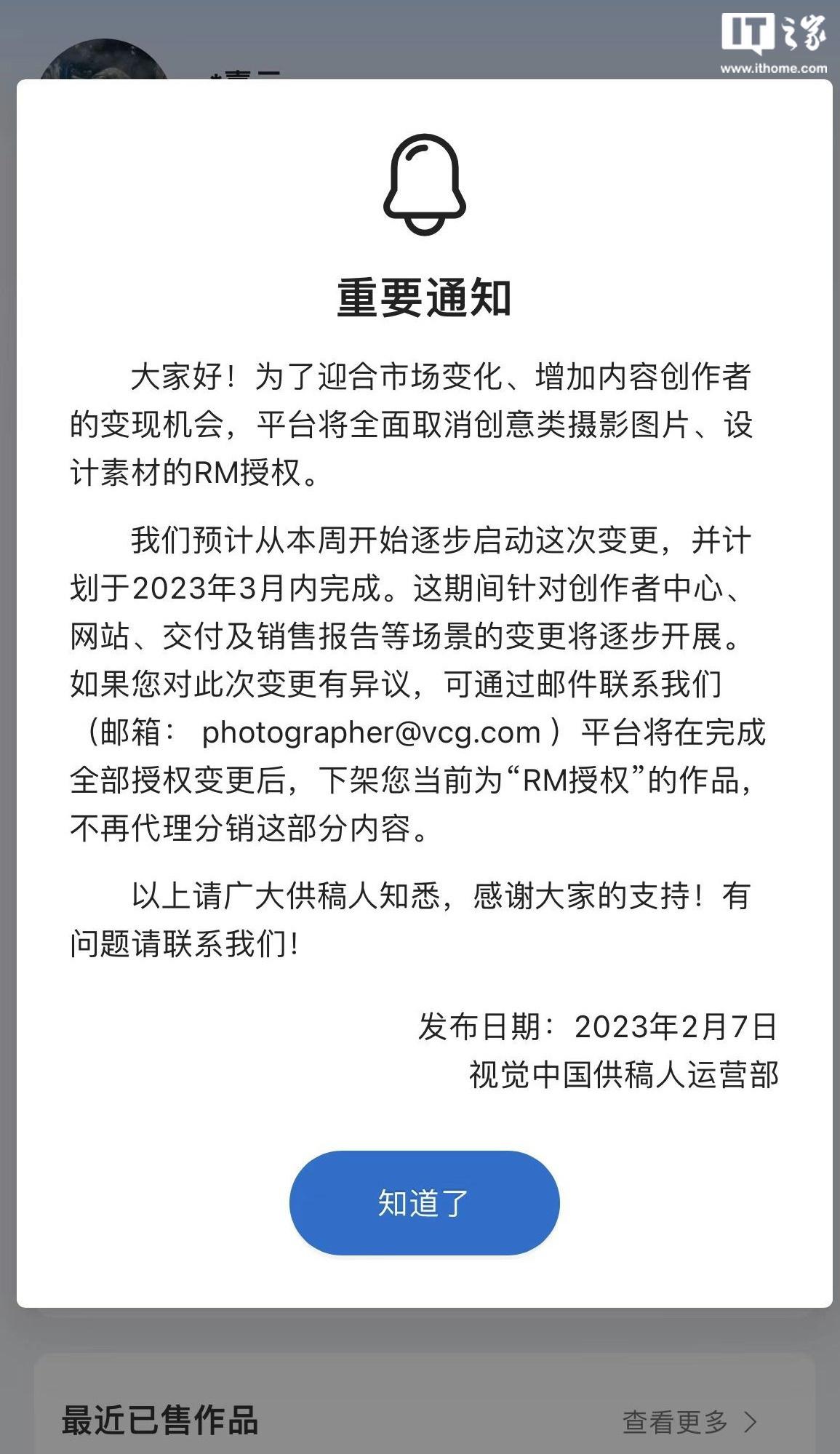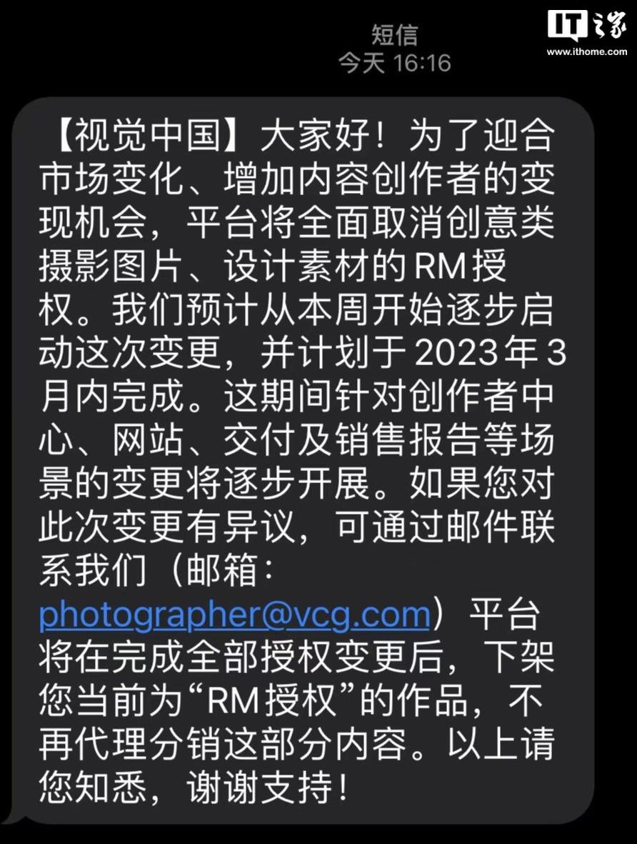 IT之家 2 月 7 日消息,视觉中国向供稿人发布公告,为了迎合市场变化、增加内容创作者的变现机会,平台将全面取消创意类摄影图片、设计素材的 RM 授权。