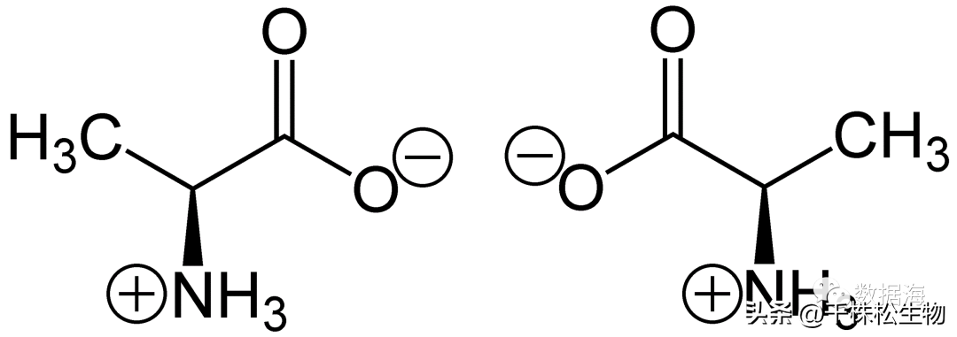 (S)-丙氨酸(左)和(R)-丙氨酸(右)在中性pH下的两性离子形式