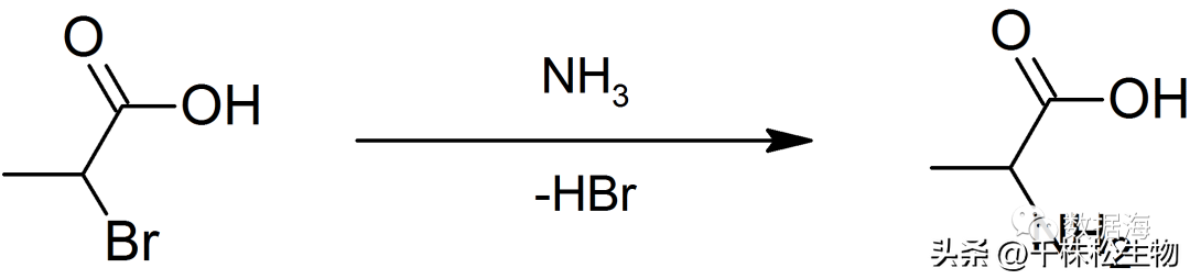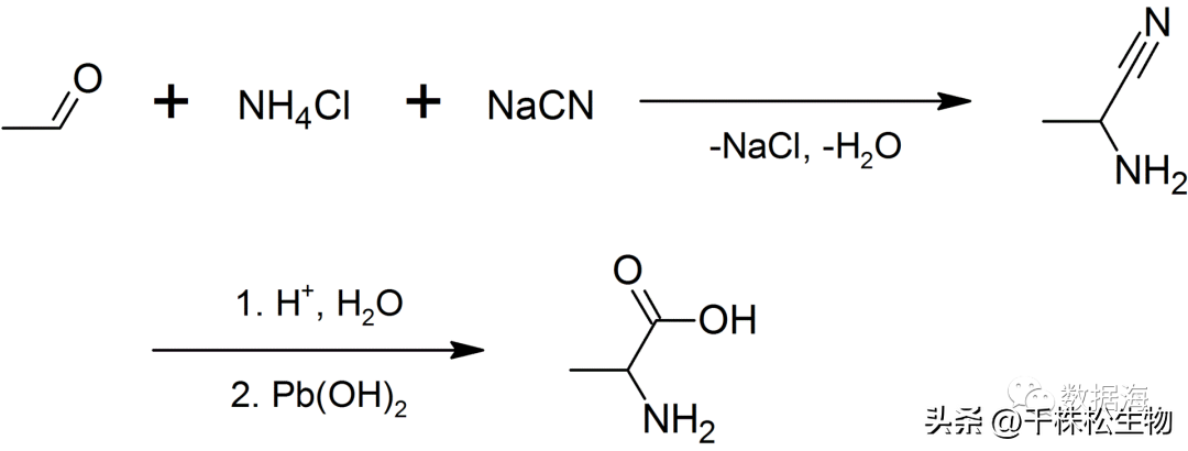 l -丙氨酸是由l -天冬氨酸通过天冬氨酸4-脱羧酶脱羧而工业化生产的。丙氨酸外消旋酶使l -丙氨酸的发酵途径变得复杂。在氰化钠存在下,乙醛与氯化铵缩合,经Strecker反应、反应或2-溴丙酸氨解可制得外消旋丙氨酸。