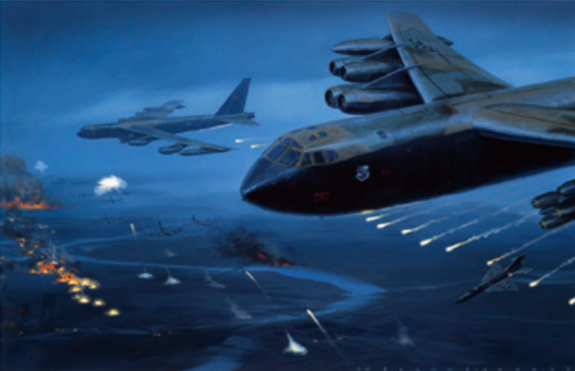 B-52轰炸机在北越上空进行轰炸画作,防空导弹实用化后美国战略轰炸机即便在夜间执行任务也付出了不菲的代价
