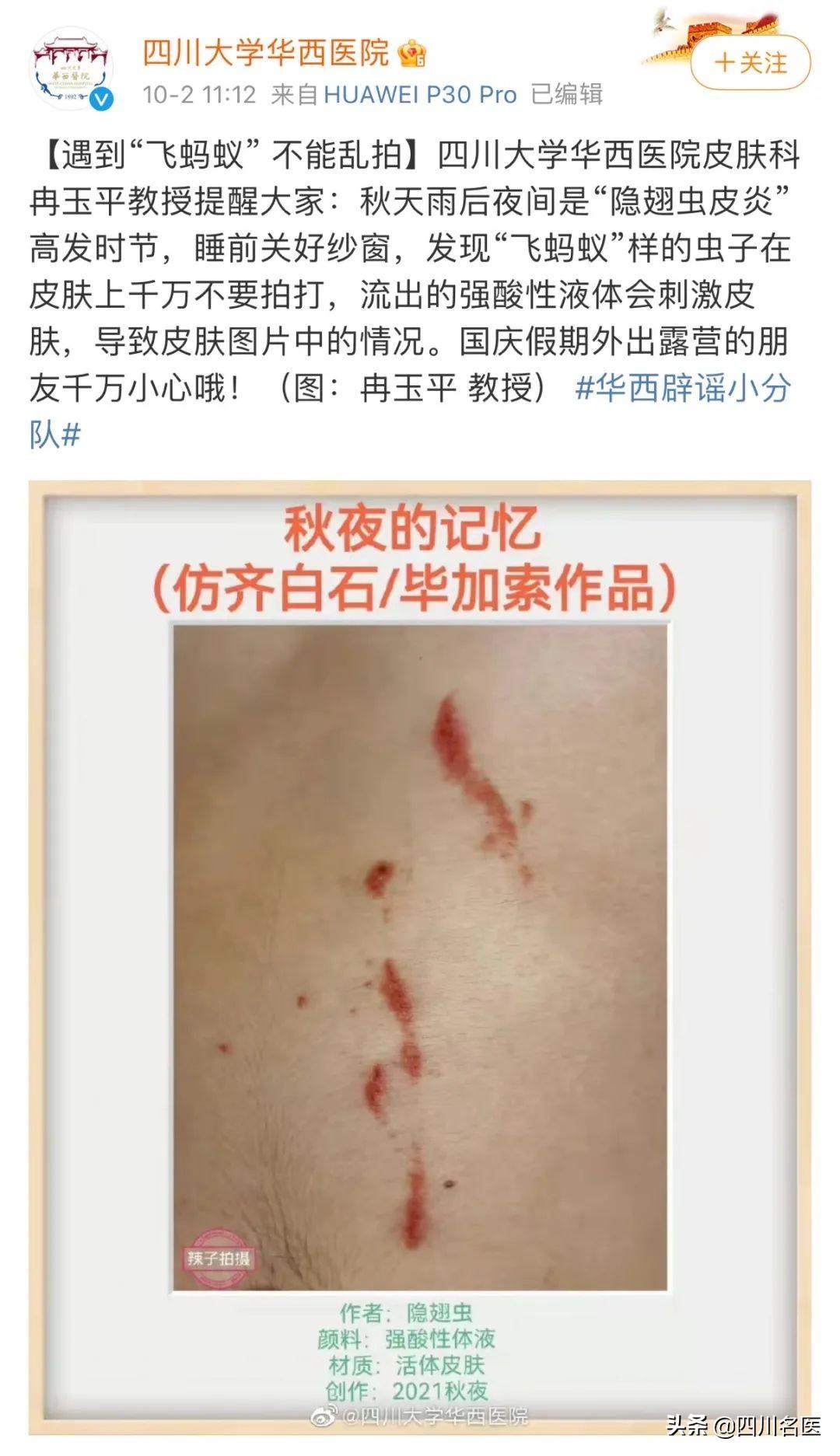 前天(10月2日),四川大学华西医院皮肤科「冉玉平教授」 发出提醒:假期外出,遇到“飞蚂蚁”千万不能拍!会流出强酸性液体!