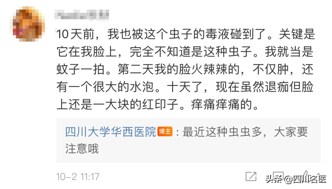 有网友也留言写到,10天前就误拍了这虫 ,结果第二天不仅脸肿,还起了很大的水泡,至今还有红印子……