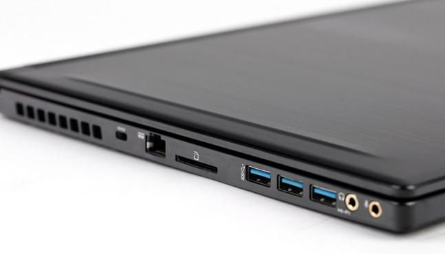 机身左侧接口,依次为网卡接口/读卡器/USB3.0X3/音频输入输出。