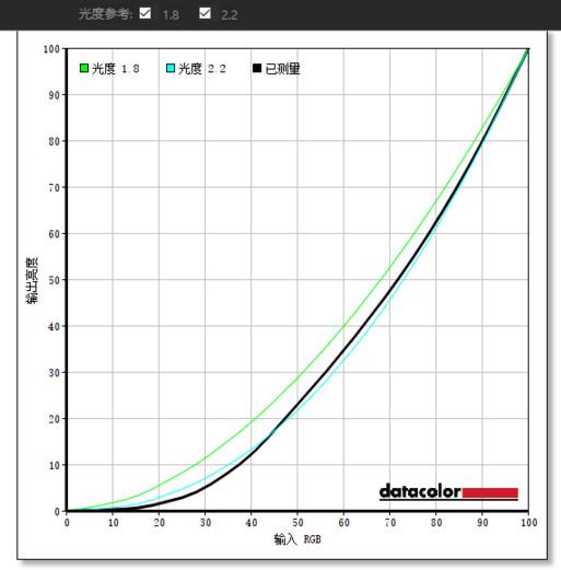 色调响应方面,测量值要尽量和“光度2.2”曲线保持一致为佳,实测有略有偏差。