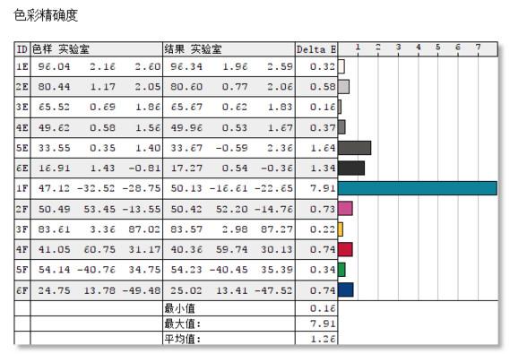 色彩精确度测试,整体表现很不错,但是1F色的偏差有点大。