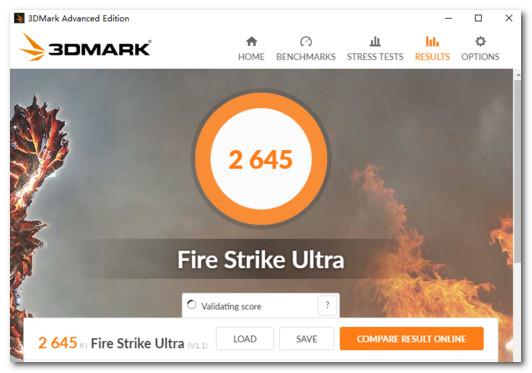 3DMark跑Fire Strike Ultra的得分为2645分。