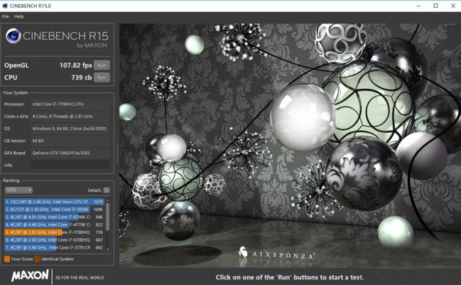 Cinebench R15测试结果,OpenGL为107.82 fps,CPU为739cb。