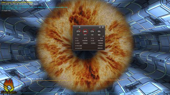 FurMark的GPU单烤测试,CPU最高温度稳定在87°,显卡最高温度稳定在79°。