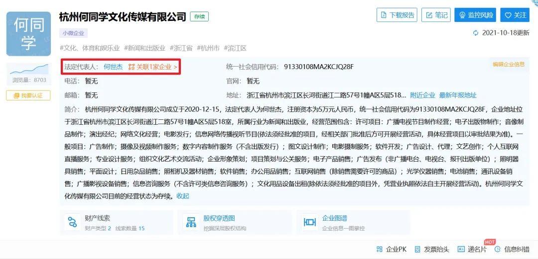 其实在去年2020年何同学就已经成立了自己的公司——杭州何同学文化传媒有限公司 ,是名副其实的"何总"。