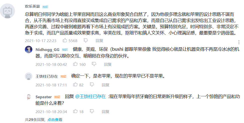 这位“欢乐英豪 ”的网友给出了客观的评价:因为他很多理念就和苹果的设计思路不谋而合,从不先看市场上有没得直接买或集成自己需求的产品和方案,而是自己从自己需求出发给出工业设计思路,再逐步完善、过程中碰到难题再看下市场上有没现成的方案。关键是,预算特别充足,时间特别多、非常淡定不急于求成,而且产品质量或效果要求高,审美在线,抠细节和搞人文关怀、小心理满足感,最重要是宁鸽毋滥 。