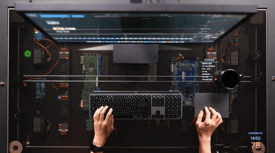 这个桌子的内部还集成了一台Macmini ,可以直接连接显示器和键鼠等。工程电脑使用除了显示充电、动画和常规信息外,这个桌子的屏幕还有三个特别的功能。每天开始时你可以给今天设定几个任务,它会显示在桌面上。当你完成一个任务,桌子上就会亮起一个点。