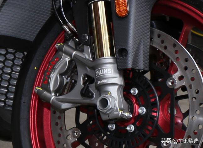 阿普利亚RSV4 RF的减震刹车方面,前轮使用了OHLINS的避震器,后轮使用了TTX避震器,就算在恶劣的路面行驶,也能很好的保持平稳。