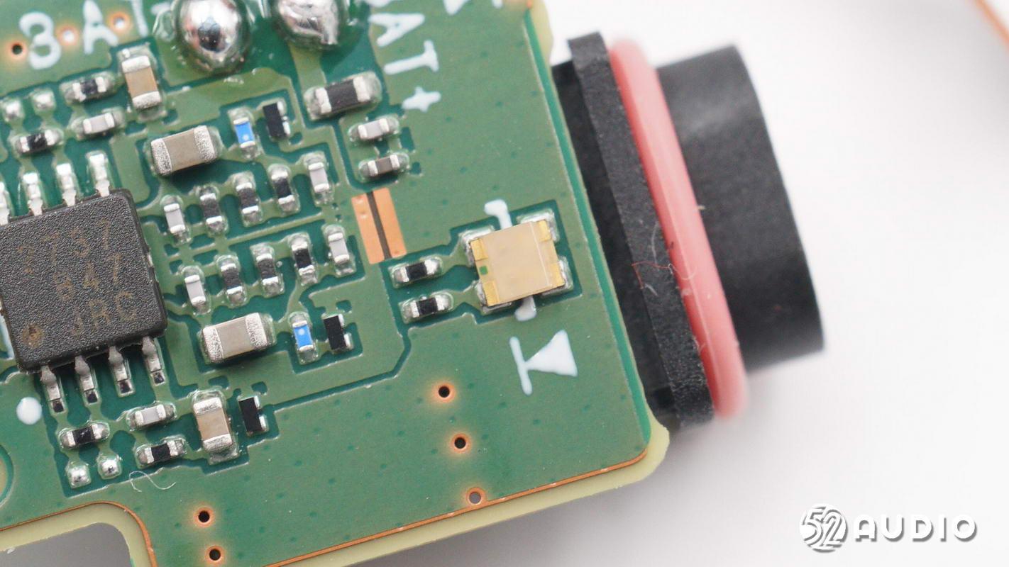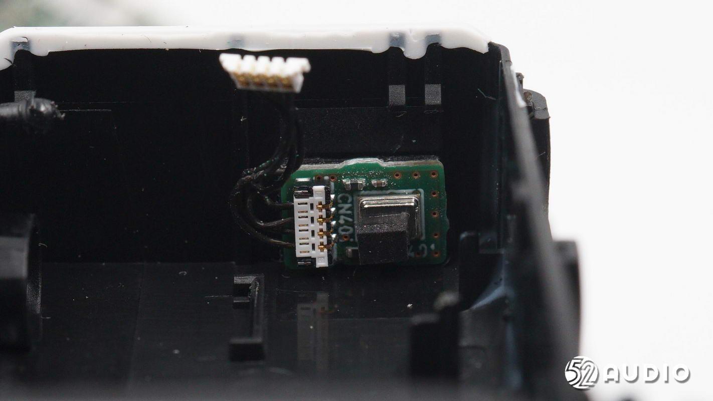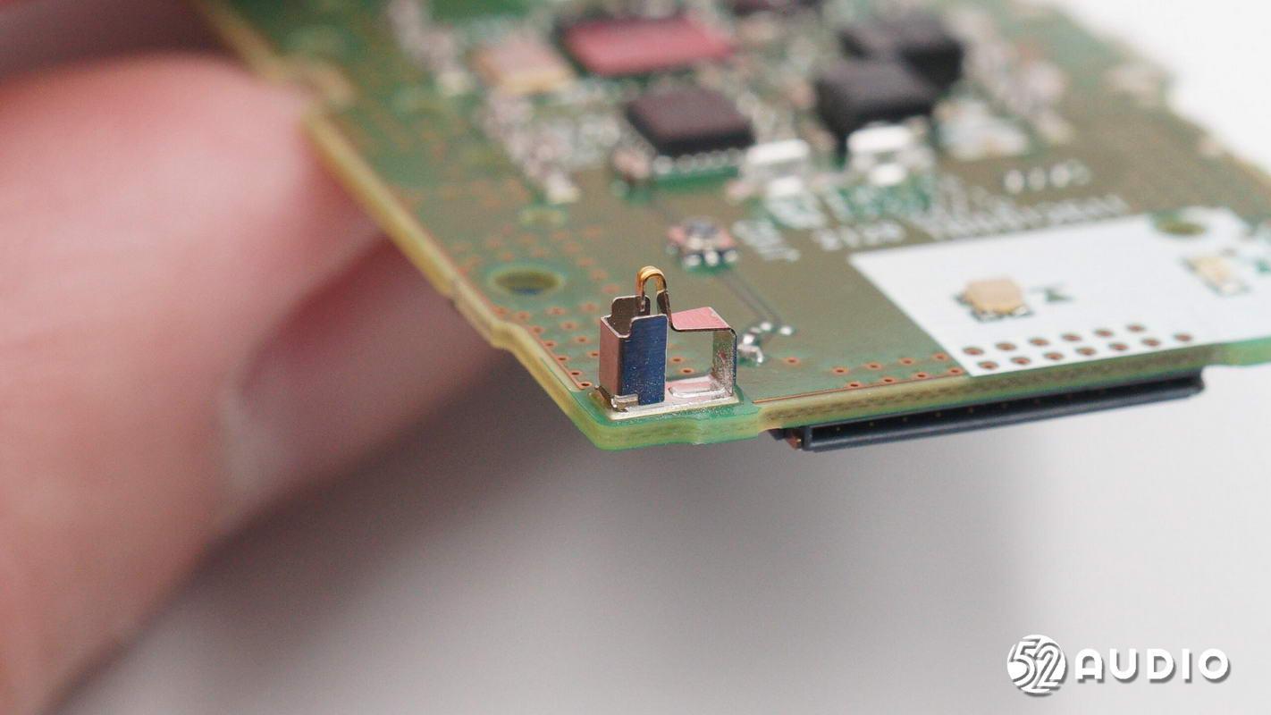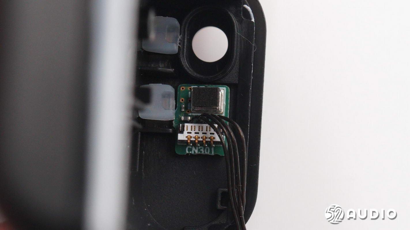 接收器底部的MEMS麦克风小板特写,小板通过ZIF连接器连接到接收器主板上。