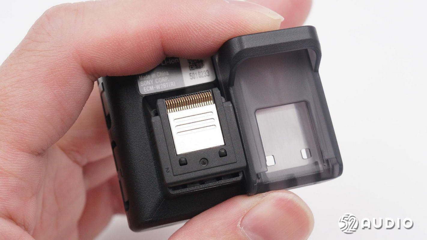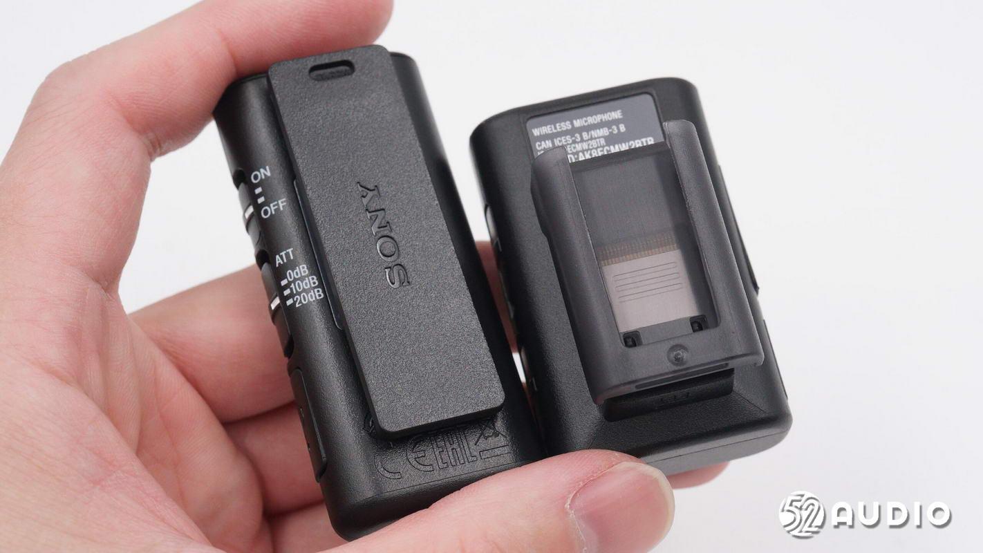 索尼ECM-W2BT无线麦克风在外观方面,麦克风发射器及接收器整体磨砂黑材质,两个设备可通过背面的热靴保护盖连接在一起,方便日常收纳。
