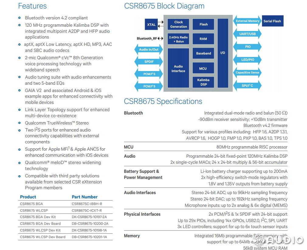 Qualcomm高通CSR8675单芯片蓝牙音频SoC,支持蓝牙4.2,支持模拟和数字拾音器,内置高通Kalimba DSP,120MHz时钟频率。无需外部元件,可以为内置锂电池提供200mA的充电电流。