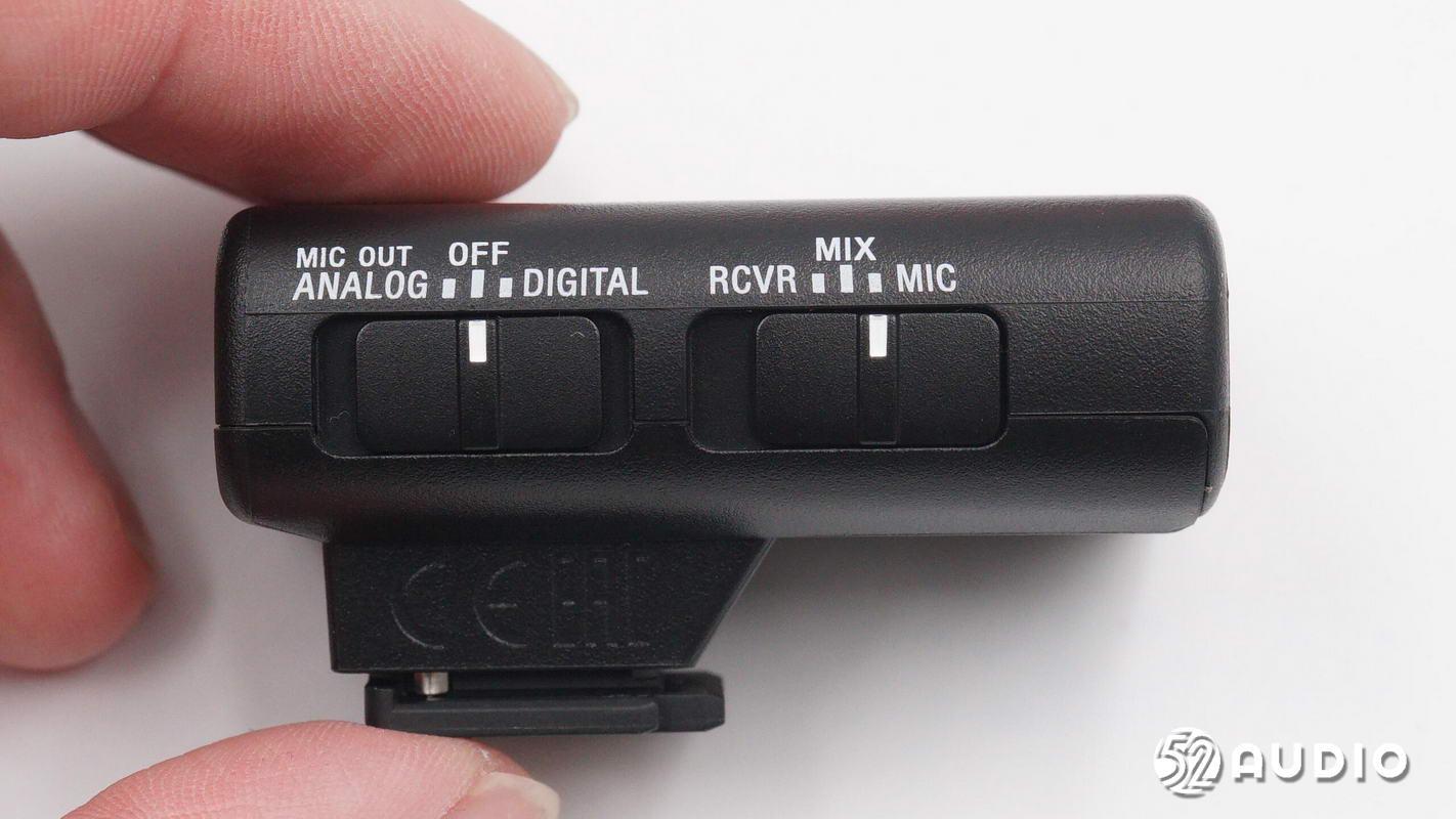 接收器在功能方面,支持“数字连接、有线连接”两种连接模式切换;内置3种不同的声音采集模式“MIC模式”、“RCVR模式”以及“MIX模式”,用于应对不同的使用环境。接收器背面设有Mi热靴可以直接连接到摄像机上,方便用户使用。