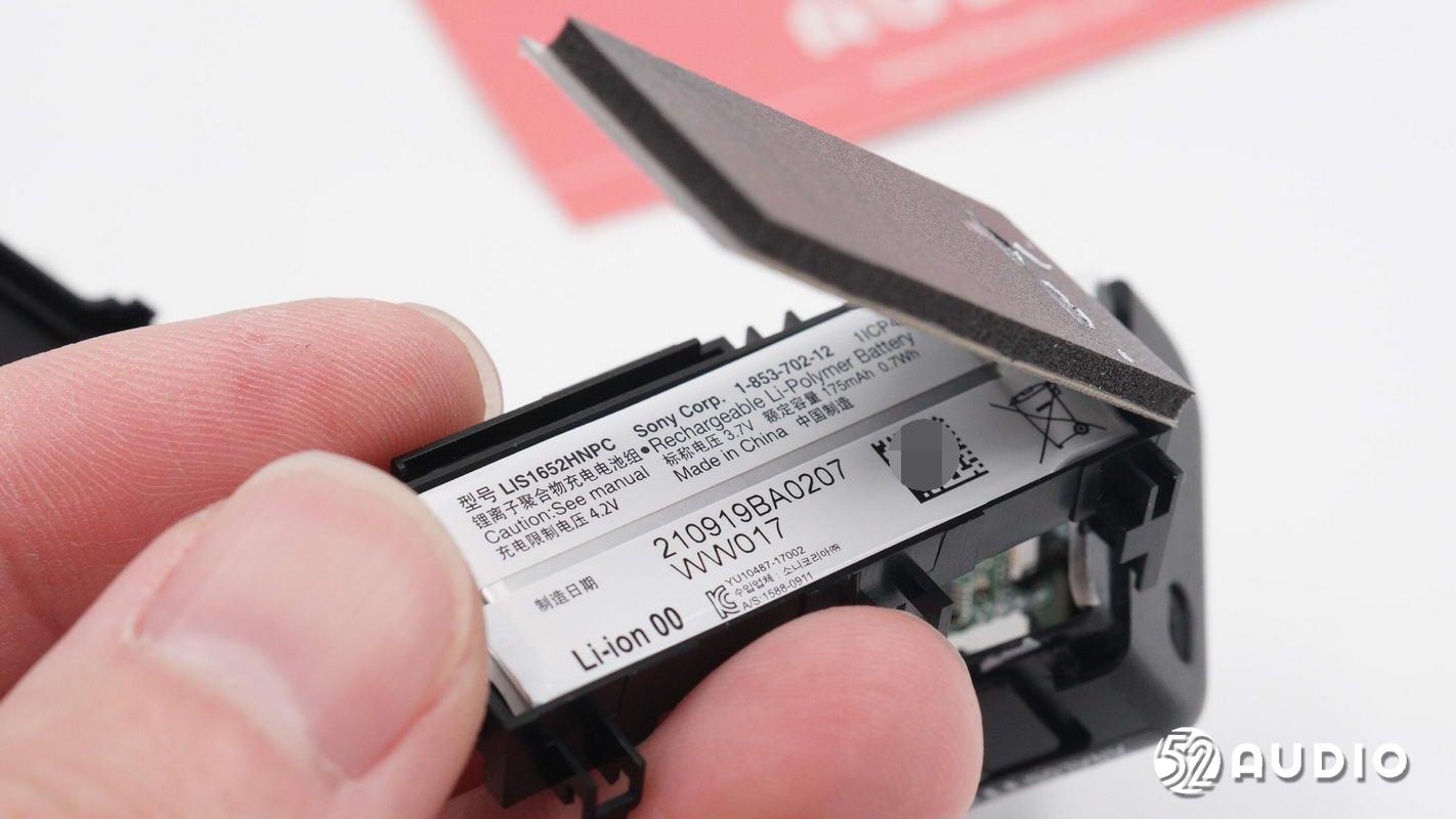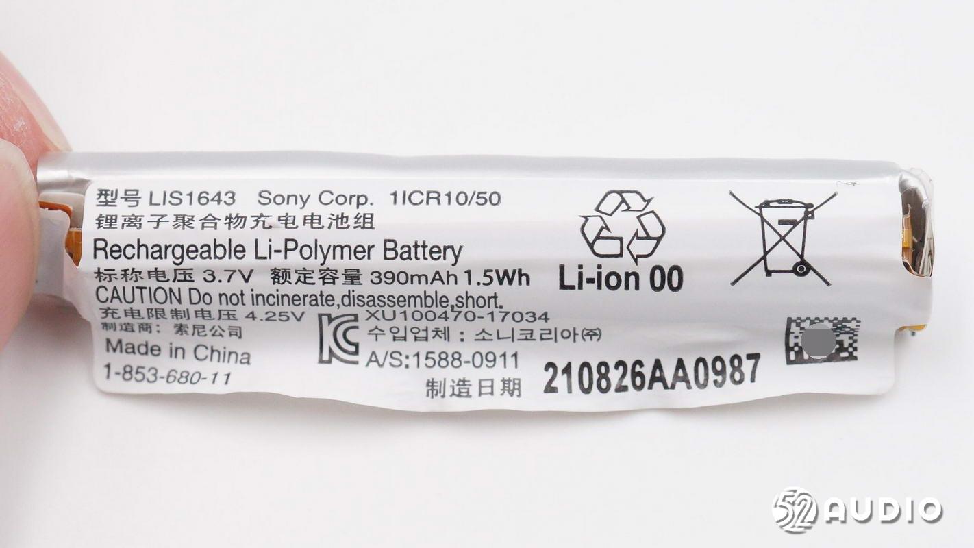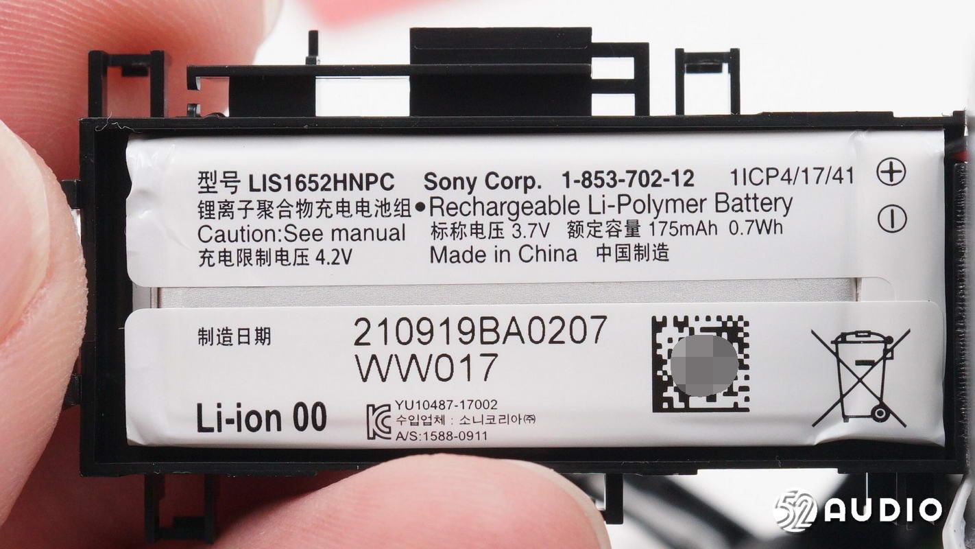接收器锂离子电池同样来自索尼,型号LIS1652HNPC,标称电压3.7V,额定容量175mAh/0.7Wh,充电限制电压4.2V。