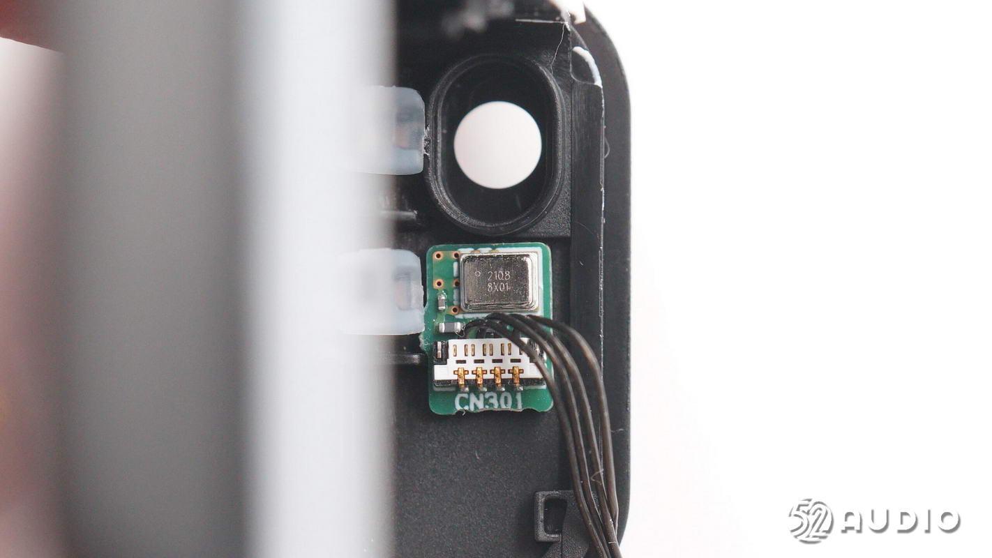 揭开MEMS麦克风背面的海绵,MEMS麦克风镭雕“2108 8x01”,麦克风小板通过ZIF连接器连接到发射器主板。