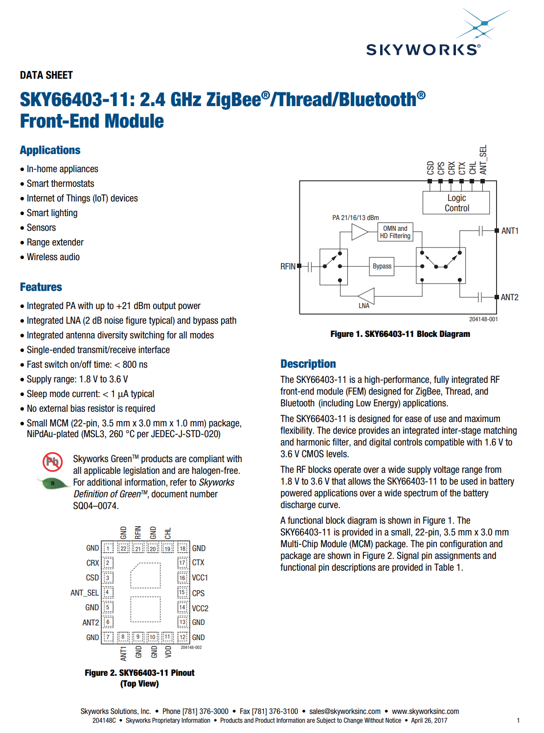 SKYWORKS思佳讯型号SKY66403-11高性能全集成射频前端,支持ZigBee,蓝牙以及蓝牙BLE应用。